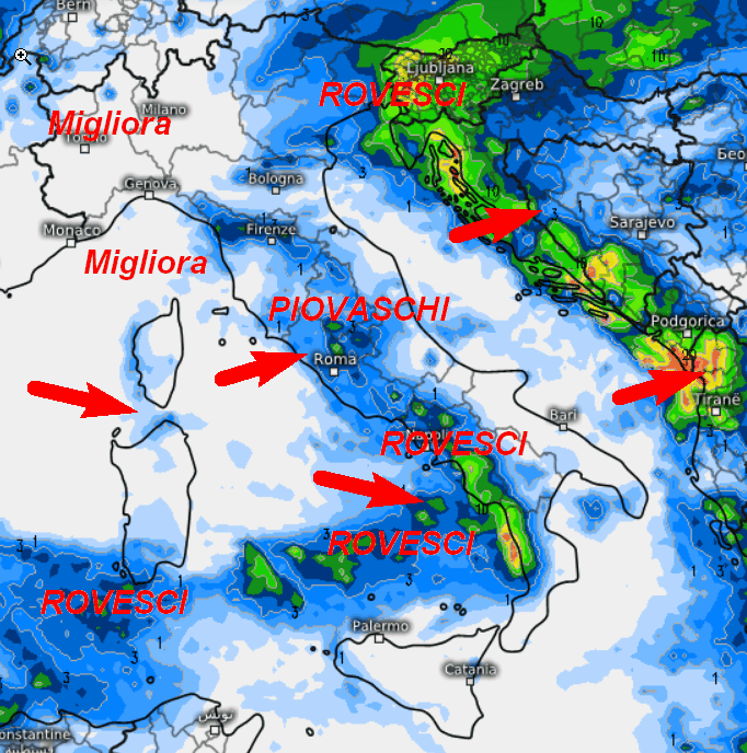 Tempo in miglioramento al nord a parte gli ultimi rovesci sul Friuli, in via di attenuazione. Ancora piovaschi nelle aree interne del centro, sulla Sardegna meridionale e soprattutto tra la Calabria e la Campania dove avremo i rovesci più forti.