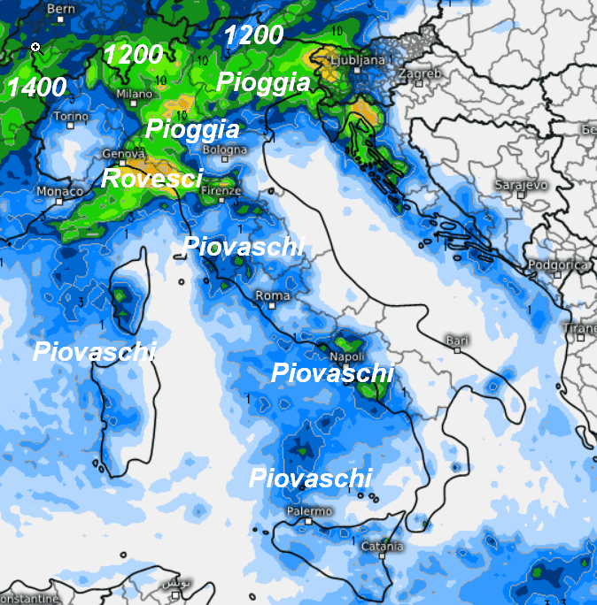 Piogge sparse e rovesci al nord ad eccezione del Piemonte e dell’Emilia Romagna che si troveranno sottovento al flusso portante da sud-ovest. Ecco le nevicate che si faranno vedere sopra i 1200 metri sull’arco alpino centro-orientale e oltre i 1400 metri in Val d’Aosta. Niente neve purtroppo sul comparto delle Alpi Marittime e sulle Alpi occidentali. Niente neve anche sull’Appennino settentrionale in quanto pioverà praticamente a tutte e quote.
