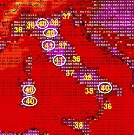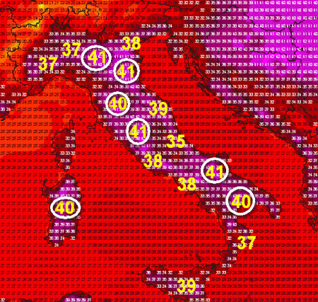 Termometro a 41° sulla Valpadana centro-orientale, le pianure interne tosco-laziali e il Foggiano; 40° sulla Sardegna, nelle zone interne della Toscana e sulla bassa Lucania. Altrove temperature ben oltre i 35°.