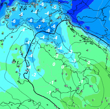 Alla medesima quota (1500 metri), sulle regioni settentrionali si prevedono isoterme comprese tra -5 e -7°. Al centro si andrà dai -5° delle aree interne e l’alto Adriatico fino ai -2° del basso Lazio e della Sardegna. Al sud si andrà invece dai -3° del Molise e gli 0/-1° della Sicilia e della Calabria.