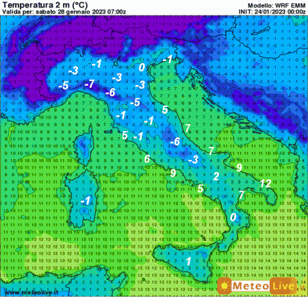 Queste invece sono le temperature attese al suolo per le prime ore di sabato 28 gennaio, attorno alle ore 7: