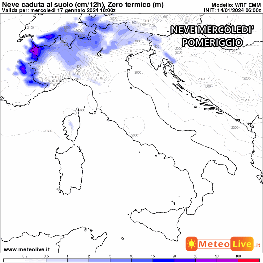All’arrivo dei venti più tiepidi, in quota, nel corso di mercoledì 17 ecco che potremo imbatterci in nevicate deboli o al limite moderate fino a bassissima quota (probabilmente anche in pianura) su Piemonte, ovest Emilia e Lombardia. Molto probabili le nevicate nei fondovalle alpini e prealpini. Il nostro modello mostra anche la possibilità di lievi accumuli bagnati sulla Lombardia occidentale (tra 1 e 2 cm):