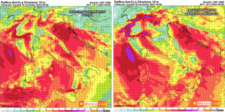 Raffiche ancor più forti, superiori ai 100 km/h (venti di tempesta) potrebbero soffiare lungo l’Appennino centro-meridionale e sulle Alpi tra Liguria, Piemonte, Valle d’Aosta, Lombardia.