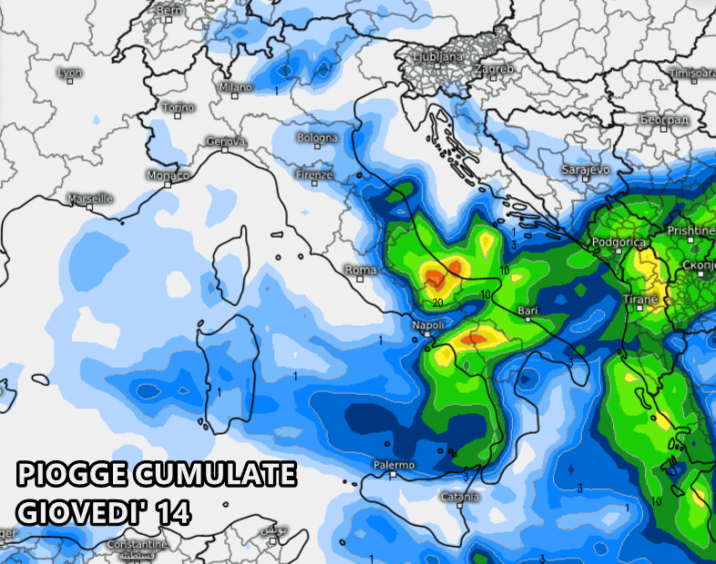 Questo fronte porterà rovesci sparsi su Romagna, Marche, Abruzzo, Umbria e Molise tra pomeriggio e sera. Entro tarda sera i fenomeni approcceranno il Gargano.