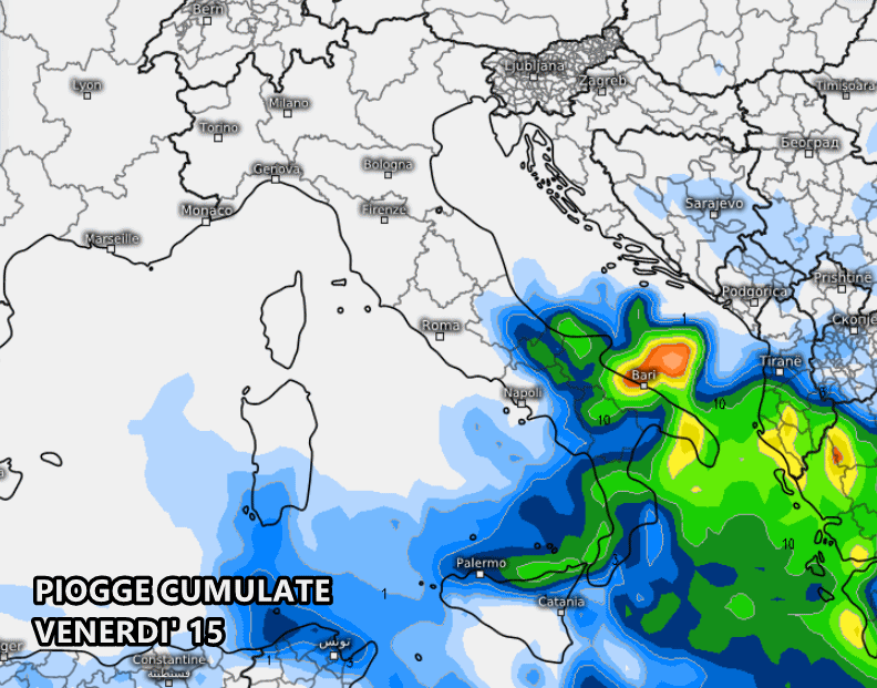 L’aria fredda scaverà una piccola depressione che attraverserà gran parte del sud Italia nel corso di venerdì. Le piogge saranno più corpose in Puglia, come non si vedevano da mesi. SI prevedono punte di oltre 50 mm sul barese. Nel frattempo migliorerà nettamente sul centro-nord.