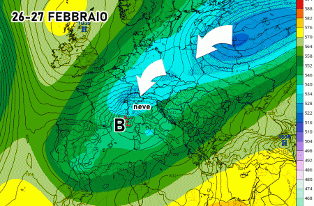 Dopo che avrà raggiunto la Corsica, questa depressione incontrerà un altro impulso freddo, questa volta proveniente dall’est Europa! Trattasi di aria molto fredda artico-continentale che intensificherà nettamente tale depressione nel corso di domenica 26 febbraio.