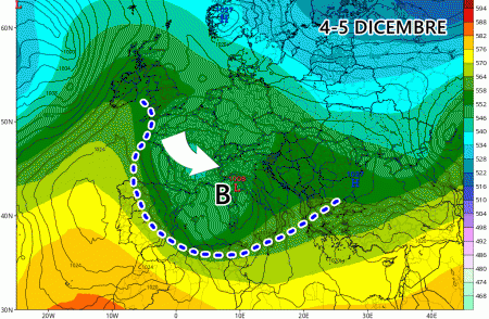 A seguire ecco che spunta un’altra ondata di maltempo, grosso modo attorno al 4-5 dicembre, anche in questo caso di stampo atlantico. Il freddo ovviamente non mancherà e sarà fondamentale per l’arrivo della neve a quote di montagna o bassa montagna, principalmente al nord e sull’Appennino centro-settentrionale.