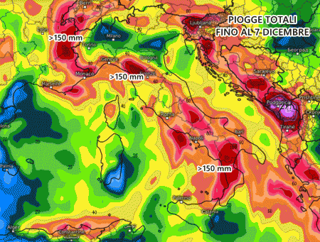 La pioggia e soprattutto la neve in montagna quantomeno non mancheranno, come si evince dalle precipitazioni totali previste fino al 7 dicembre!