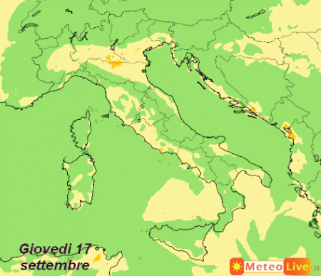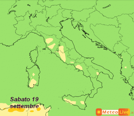 Infine ecco la situazione prevista per sabato 19 settembre, dove si evince chiaramente che il disagio si è molto ridotto, pur persistendo su limitate aree del territorio. E’ evidente che l’estate, indipendentemente da che tempo faccia, stia ormai volgendo alla sua naturale conclusione.