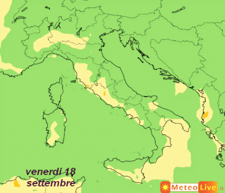 Ecco la seconda mappa, prevista per venerdì 18 settembre, dove si evidenzia ancora la presenza di un certo disagio, ma già inferiore al giorno precedente, resterà un certo fastidio sul catino padano, sull’alto e medio Tirreno e sull’area jonica: