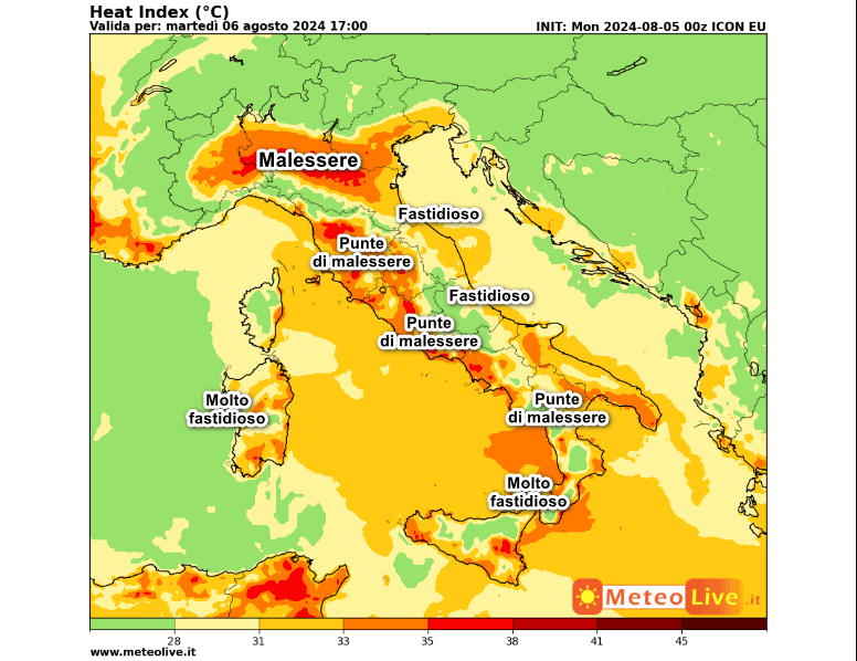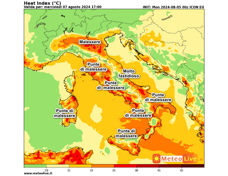 Condizioni di MALESSERE FISICO in Valpadana, specie sul settore orientale, ma punte di MALESSERE saranno presenti nelle aree interne dell’Italia centro-meridionale, escluse ovviamente le zone montuose. Caldo MOLTO FASTODIOSO su Sicilia, Sardegna ed estremo sud, solo FASTIDIOSO invece lungo il versante adriatico.