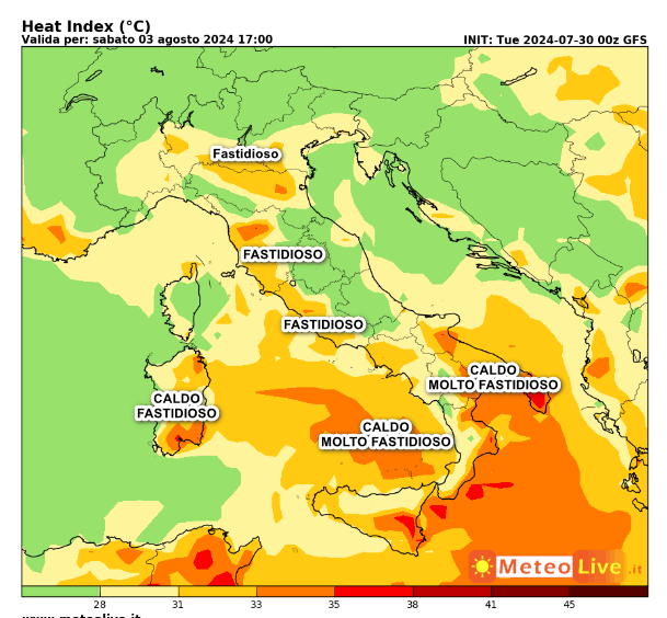 Questo invece è l’indice di disagio da caldo previsto in Italia alle ore 17 di sabato 3 agosto: