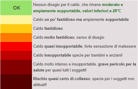 MASSIMA ATTENZIONE alla Pianura Padana dove il caldo si prevede INSOPPORTABILE. Da evitare assolutamente le uscite nelle ore più calde specie per anziani, bambini e soggetti con problemi respiratori. MALESSERE FISICO DIFFUSO sarà presente su molte aree del centro, sulla Sicilia e sulla Sardegna. Al meridione andrà un po’ meglio con caldo FASTIDIOSO o localmente MOLTO FASTIDIOSO, ma senza punte di malessere o caldo insopportabile.