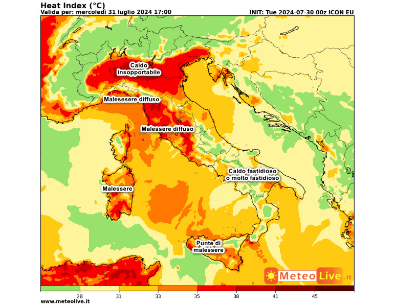 La prima mappa mostra il disagio da caldo previsto in Italia alle ore 17 di mercoledi 31 luglio: