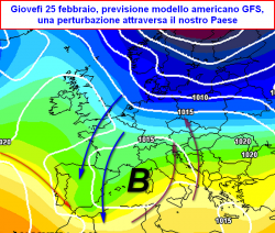 Una seconda perturbazione attraverserà il nostro Paese tra giovedì 25 e venerdì 26 febbraio, più intensa rispetto alla precedente, apporterà anche un calo modesto delle temperature (più sensibile alle quote superiori) estendendo la sua influenza sino ai settori meridionali dello stivale soprattutto venerdì 26.