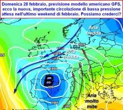 La depressione più importante di questa terza decade di febbraio potrebbe essere quella attesa negli ultimi giorni di febbraio; prevista stabilire il proprio perno tra l’Iberia ed il golfo di Biscaglia, potrebbe generare un ampio sistema nuvoloso che dai settori occidentali d’Europa e Mediterraneo, muoverebbe rapidamente verso l’Italia col suo importante carico di precipitazioni.