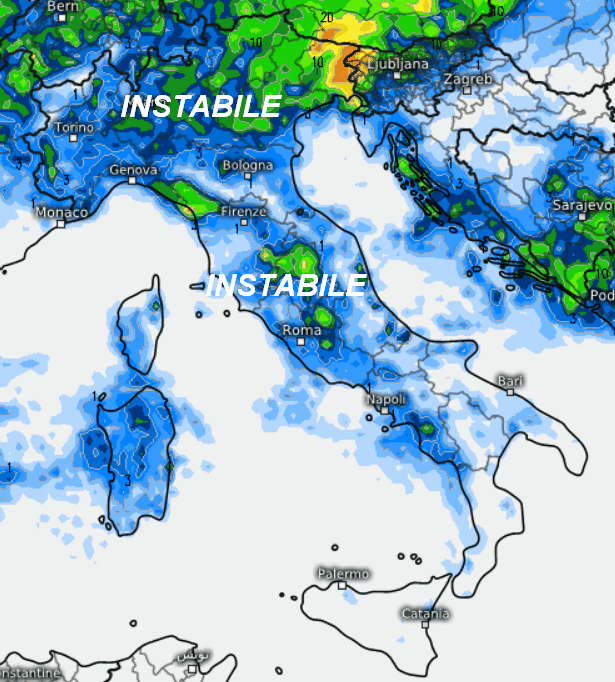 Tempo instabile al nord, su gran parte del centro, sulla Sardegna e sulla Campania. Tempo instabile significa NON AFFIDABILE, ovvero con presenza di schiarite, ma alternate ad addensamenti intensi forieri di acquazzoni e temporali sparsi. Andrà meglio sulle estreme regioni meridionali e sulla Sicilia dove la probabilità di pioggia sarà minore.