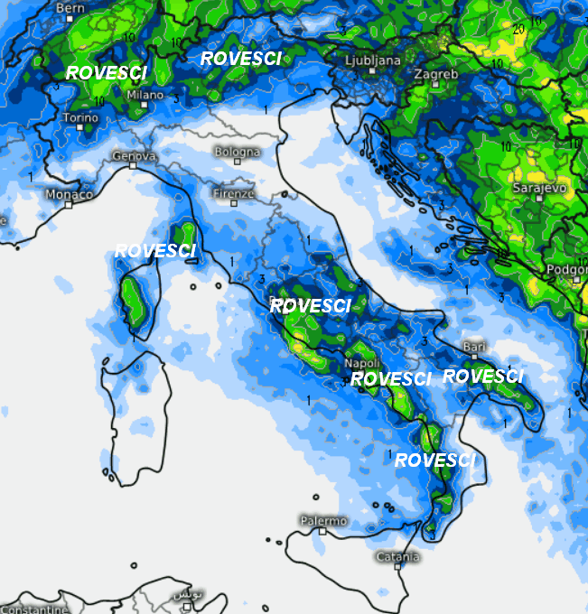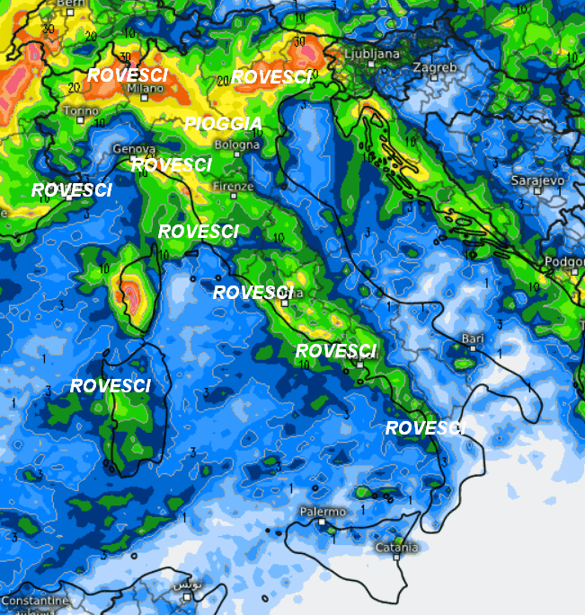 L’Italia verrà raggiunta da un secondo sistema frontale che elargirà altre piogge al nord, lungo le regioni tirreniche e nelle aree interne. A tratti avremo rovesci o temporali anche di una certa intensità. Tempo variabile/instabile sulla Sardegna con rovesci alternati a pause soleggiate, mentre lungo il versante adriatico e sulle estreme regioni meridionali il rischio di pioggia sarà più contenuto. Caleranno anche le temperature e la neve si rifarà vedere sulle Alpi e l’Appennino settentrionale oltre i 1400-1600 metri.
