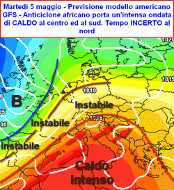 Un attivo promontorio d’alta pressione di origine africana, trascinerà con sè aria molto calda originaria delle aree desertiche sahariane. Se ne accorgeranno gli abitanti delle regioni meridionali che dovranno ben presto fare i conti con una impennata delle temperature che rischia di portare la colonnina di mercurio oltre i 30°C su gran parte delle zone interne, con punte addirittura di 40°C nelle aree interne della Sardegna. L’apice del calore è atteso tra martedì 5 e mercoledì 6 maggio. Lungo le coste la superficie marina ancora fresca, agevolerà l’innesco delle brezze che aiuteranno a mantenere valori un po’ più freschi.