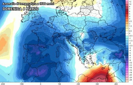 Eloquenti le anomalie di temperatura a 1500 metri per il fine settimana 5-6 marzo:
