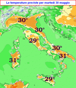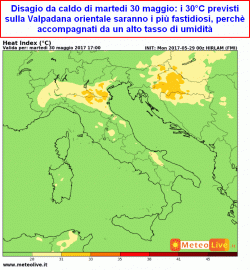 La giornata di martedì 30 maggio risulterà la peggiore sul fronte del caldo, poiché alle alte temperature si combinerà anche un alto tasso di umidità, specie sulla pianura padana orientale.