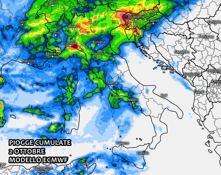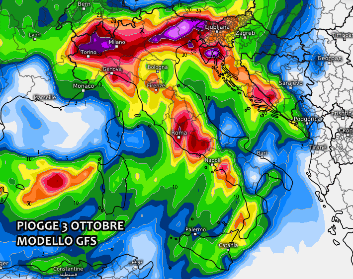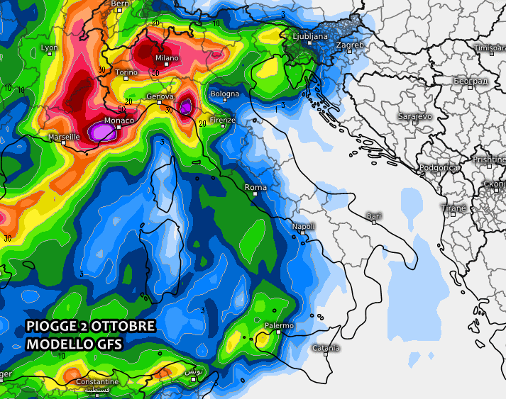 Non a caso gli ultime stime pluviometriche sono decisamente ragguardevoli. In particolare il modello americano GFS mostra forti piogge già dal 2 ottobre sul Nordovest, con picchi superiori ai 60-70 mm. Non si escludono temporali stazionari e autorigeneranti tra Liguria, Piemonte e Lombardia, in grado di scaricare piogge ancor più forti di quelle previste.