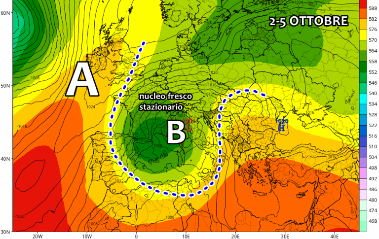 Un nucleo freddo potrebbe scivolare nel Mediterraneo a partire dal 2 Ottobre, generando un ciclone molto insidioso, con una traiettoria favorevole alle abbondanti precipitazioni. Secondo gli ultimi aggiornamenti pare che il centro di bassa pressione possa svilupparsi nel basso Mediterraneo e risalire verso nord con un enorme carico di umidità e instabilità.
