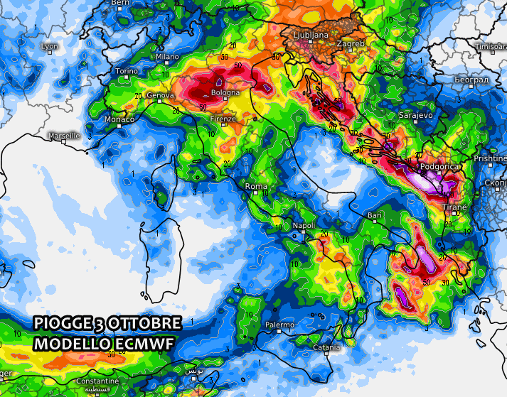 Anche ECMWF propone un 3 ottobre autunnale e con l’ombrello a portata di mano, ma con evidenti accumuli inferiori rispetto al collega americano.