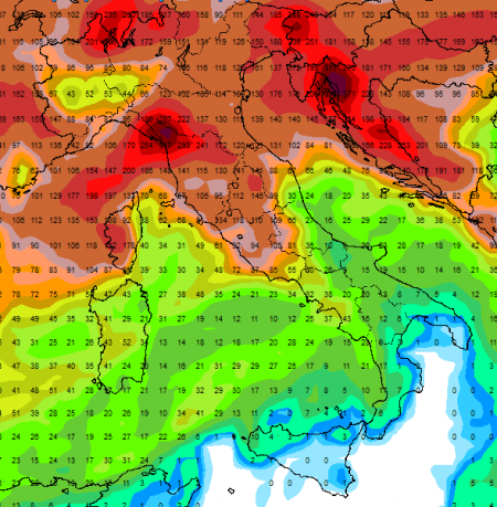 Se andassero in porto tutte le potenziali situazioni perturbate previste pioverebbe un po’ ovunque, ma ad esempio secondo il modello americano i fenomeni risulterebbero più abbondanti su Alpi, regioni di nord-est, alta Toscana (punte oltre i 240mm) e versante tirrenico in genere, come vediamo in questa mappa che riassume tutti i fenomeni previsti sino al 23 ottobre:
