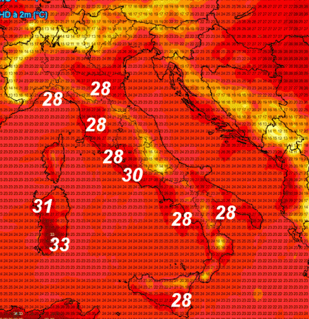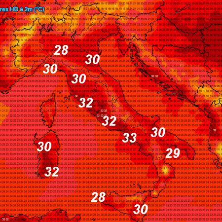 Temperature superiori a 30° saranno possibili sulla Sardegna, nel Lazio e forse anche nel ponente della Liguria. Su tutte e altre regioni avremo temperature al di sotto dei 30° con clima gradevole specie in Adriatico e nelle aree interne del centro-sud stante la presenza di venti anche intensi da nord-est.