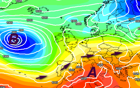 C’è invece chi, come il modello europeo, vede questo intervallo molto breve e di scarsa efficacia, come vediamo qui sotto, perchè da ovest una saccatura ne minerebbe la resistenza in breve tempo, spazzando via il promontorio: