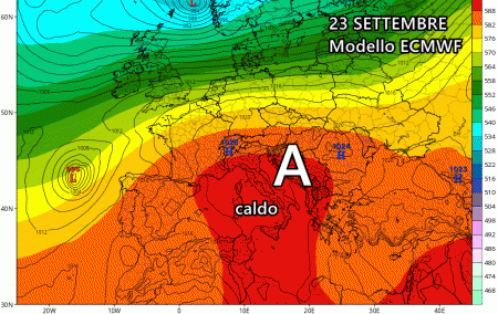 Nelle ultime ore, è emersa nuovamente l’ipotesi di un prolungamento dell’alta pressione all’interno del Mediterraneo. Il modello europeo ECMWF suggerisce un forte anticiclone che si estenderebbe su tutta l’Italia, portando temperature superiori alle medie stagionali da nord a sud proprio durante l’equinozio d’autunno previsto per il 23 settembre: