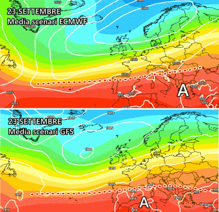 Tuttavia, come avete notato, si tratta di due scenari completamente opposti per una previsione che è ancora distante di 9 giorni. Per trovare una soluzione intermedia, possiamo analizzare le medie degli scenari di entrambi i modelli, che sono più vicine tra loro e suggeriscono un’ipotesi in cui un anticiclone è posizionato sull’Italia, ma con deboli correnti da ovest che interagiscono principalmente con il Nord Italia: