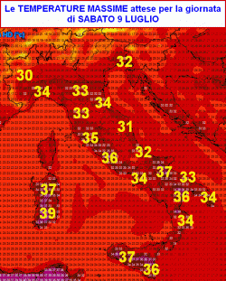 La prima mappa ci mostra il quadro delle temperature massime previste per la giornata di sabato 9 luglio.
