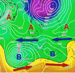 Una attiva perturbazione incernierata nelle spire di questo vortice si portò verso la Spagna piegando poi verso il Tirreno dove si impose con un minimo di 1004 hectopascal. Anticiclone delle Azzorre rintanato sotto il 40° parallelo.
