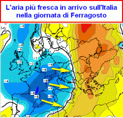 La cartina in questione si riferisce alla giornata di Ferragosto in Italia. Appare ben evidente la "forzata" delle correnti fresche occidentali, che scacceranno il caldo dal bel Paese, facendolo rintanare più ad est, in direzione della Grecia.