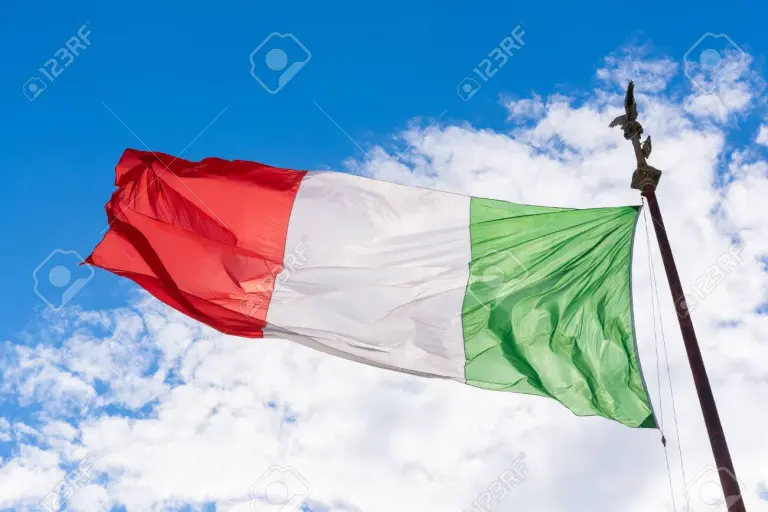 Flag of Italy in the wind. Sunny summer sky background.