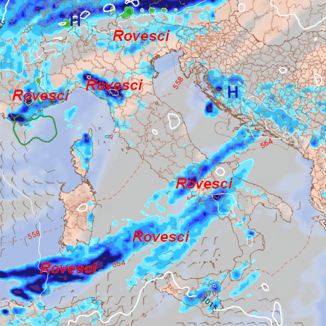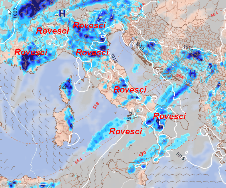 Rovesci e temporali saranno maggiormente probabili su Alpi Marittime, Appennino Ligure e parte del settore alpino centro-orientale. Rovesci anche tra il sud della Sardegna, la Campania, il nord della Calabria ed in parte sulla Sicilia.