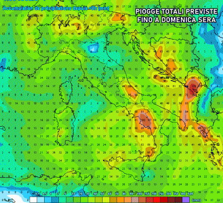 Complessivamente le piogge potrebbero bagnare buona parte d’Italia. Le aree più esposte saranno Campania, Calabria, Puglia, Abruzzo e l’arco alpino. Questi sono gli accumuli di pioggia totali previsti fino a domenica sera: