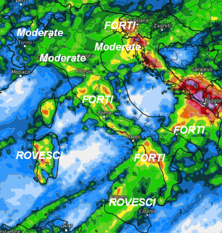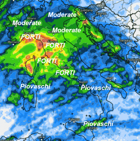 Piogge in genere moderate al nord con neve sulle Alpi, forti solo sul Friuli. Rovesci intensi saranno presenti tra la bassa Toscana, la Sardegna occidentale, l’Umbria, il Lazio, la Campania, la Calabria Tirrenica e la Sicilia. Un po’ in ombra il medio Adriatico e la Sardegna orientale.