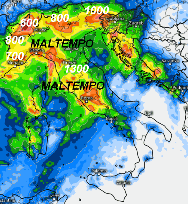 MALTEMPO al nord, regioni centrali tirreniche, interne e Sardegna fino alla Campania con piogge anche intense e nevicate abbondanti su tutta la chiostra alpina oltre i 600-800 metri sul nord-ovest, 1000 metri al nord-est. Possibili intrusioni nevose più in basso in caso di rovesci intensi e nelle valli strette interessate da omeotermia. In giornata si attenueranno i fenomeni al nord-ovest con clima maggiormente variabile. Probabile assenza di precipitazioni al sud (eccetto la Campania) e il medio-basso Adriatico. Temperature in calo al nord, stazionarie sul resto d’Italia. Forti venti al transito della perturbazione.