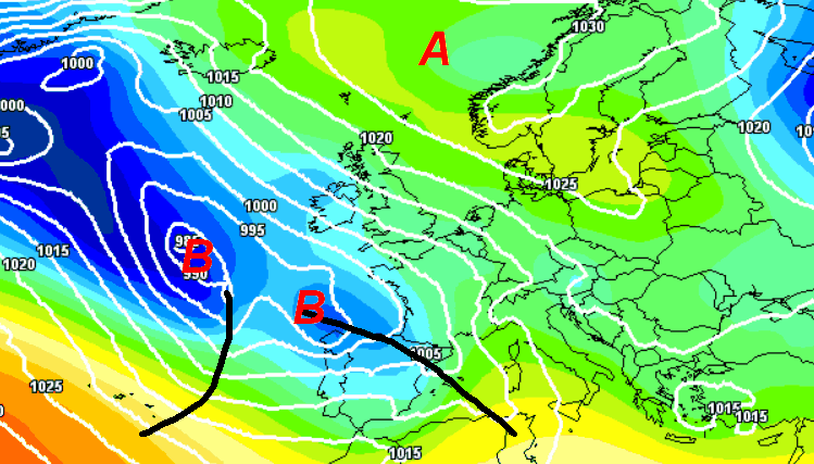 Osservate la vasta area depressionaria che porterà un minimo ad occhiale ospitante due diverse perturbazioni. La prima interesserà il nord ed il Tirreno tra il pomeriggio-sera di venerdi e la notte su sabato, per poi spostarsi sul resto d’Italia. La seconda, più intensa, inizierà ad agire sul nord-ovest sabato sera e domenica darà luogo a maltempo su molte aree della nostra Penisola.