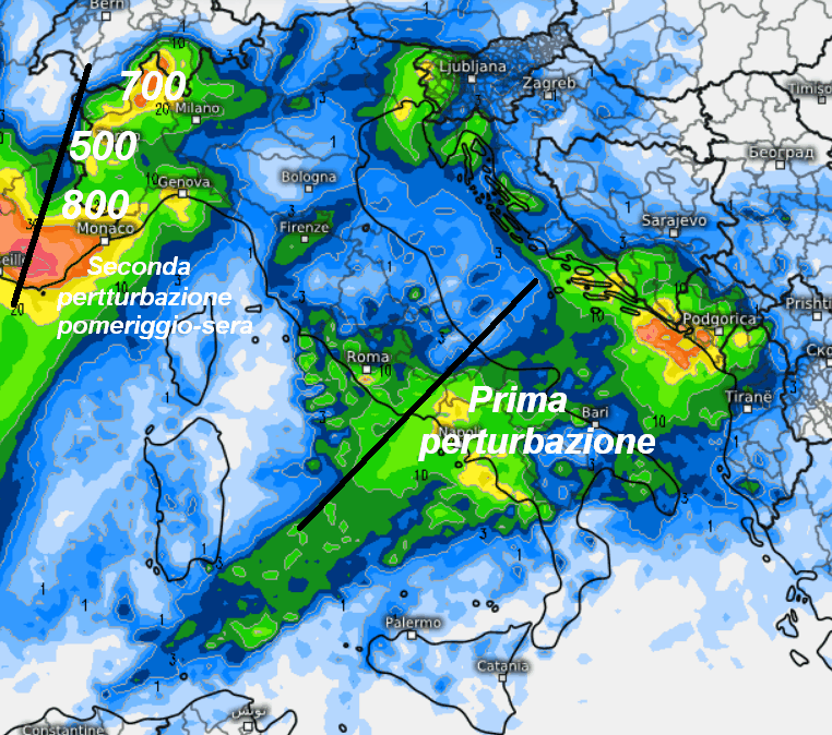 La situazione sarà molto evolutiva. La prima perturbazione che nella notte interesserà il settentrione e il Tirreno, si sposterà più ad est e darà piogge su gran parte del centro-sud ad eccezione della Sicilia e le regioni estreme. A seguire avremo 6-8 ore di tregua in cui smetterà di piovere e il cielo potrebbe anche schiarire. Tra il pomeriggio e la serata la seconda perturbazione inizierà ad agire sul nord-ovest con piogge anche forti ed in intensificazione nella notte su domenica. Quota neve tra i 500 e gli 800 metri sulle Alpi, 1000 metri sull’Appennino Ligure. Nel frattempo, smetterà di piovere al centro e al meridione.