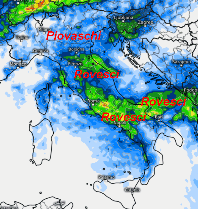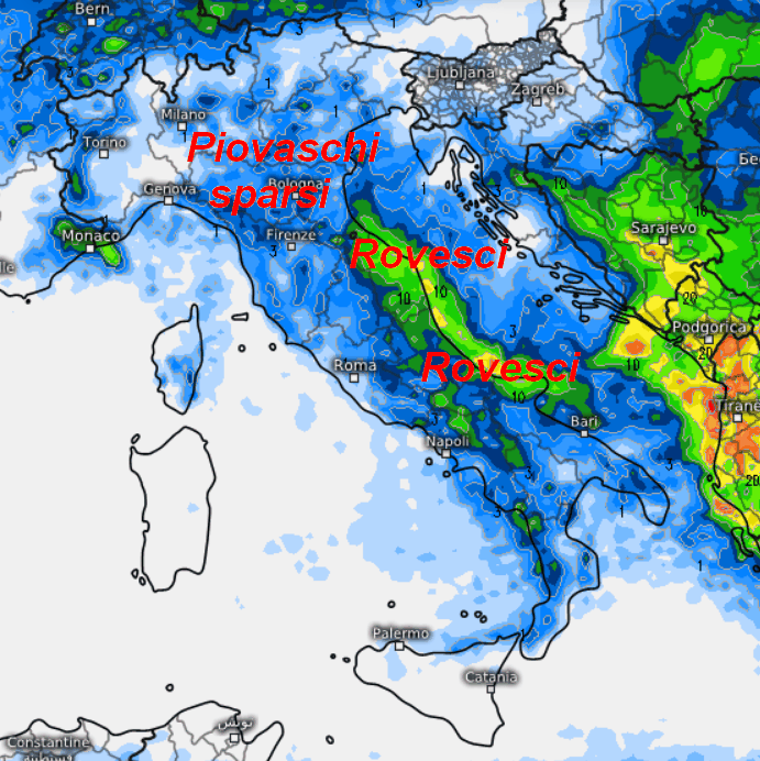 Rovesci soprattutto al centro e su parte del meridione. Piovaschi presenti comunque anche al nord, mentre il tempo sembra essere migliore sulle Isole e l’estremo sud. Attenzione alle nevicate che potrebbero scendere oltre i 1000-1200 metri sull’Appennino centro-settentrionale, anche se la quota neve sarà ancora da definire del dettaglio.