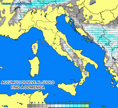 Eloquenti gli accumuli di neve totali previsti fino a domenica, con l’Appennino centro-meridionale vero obiettivo della dama bianca. Avremo inoltre anche nevicate da stau lungo i settori alpini di confine, specie su Lombardia, Alto Adige, Veneto e Friuli.