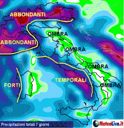 Sussistono ancora incertezze sul reale calo termico che interverrà sull’Italia nel corso della prossima settimana, mentre dal punto di vista delle precipitazioni sembra che ormai non vi siano più dubbi. Su alcune zone d’Italia queste risulteranno intense ed abbondanti. Le regioni che dovranno sopportare un carico piovoso notevole saranno quelle sopravvento al flusso portante da sud.