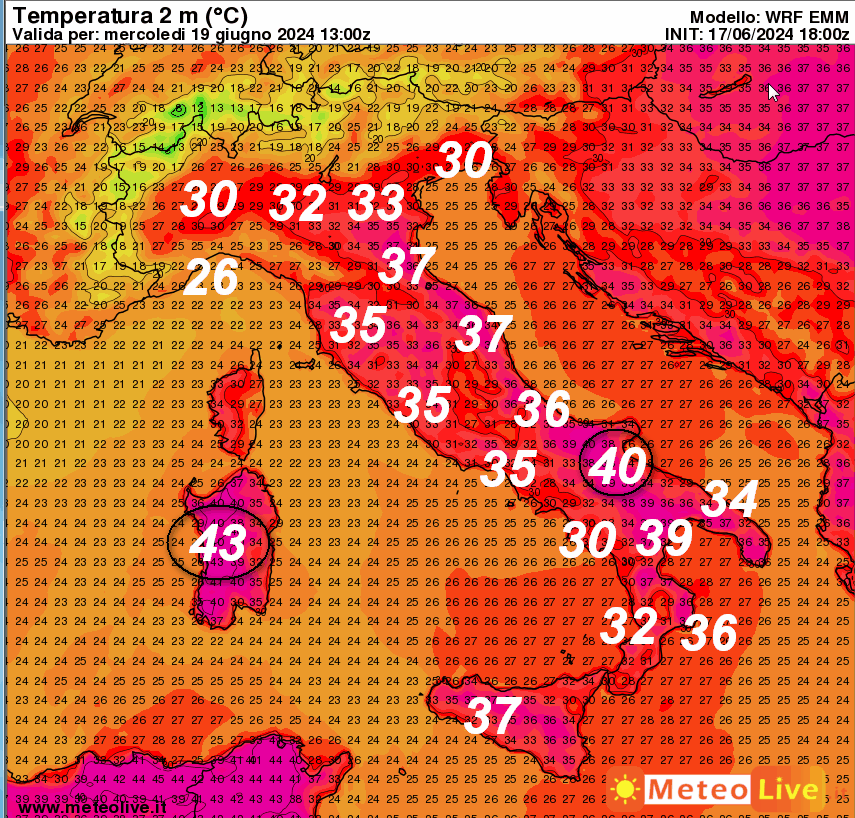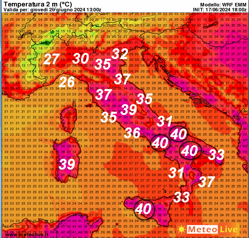 Abbiamo cerchiato in nero le aree che faranno registrare temperature prossime o superiori a 40°. Massima attenzione nelle aree interne della Sardegna in quanto si potrebbero toccare i 43°! 40° saranno possibili anche nel Foggiano, in Puglia. Molti valori superiori a 35° nelle aree interne del centro-sud e sull’Emilia Romagna. Si starà un po’ meglio lungo le coste, stante la presenza del mare ancora freddo.