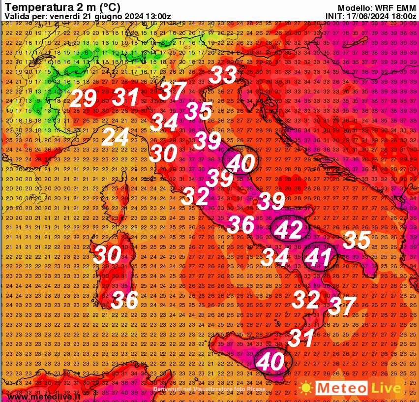 Termometro a 42° sul Foggiano, 41° sulla bassa Lucania, 40° nelle aree interne delle Marche e sulla Sicilia, 39-40° possibili anche sull’Umbria e le aree interne dell’Italia centrale. Un lieve calo termico potrebbe intervenire invece sulla Sardegna.