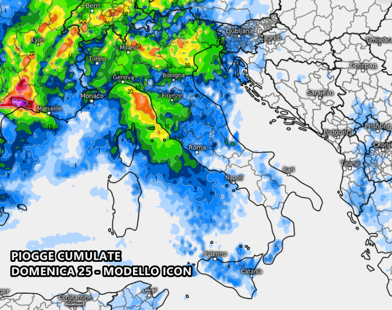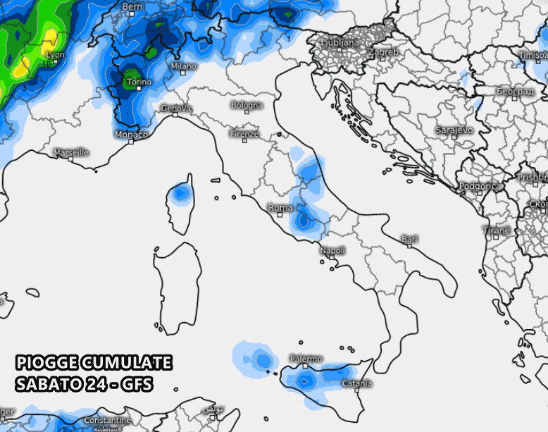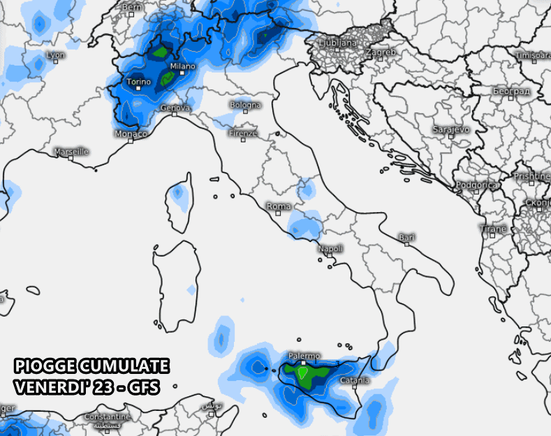 Qualche rovescio o temporale potrebbe nuovamente mostrarsi in Italia nella giornata di venerdì 23. Dalla mappa delle precipitazioni previste vediamo un maggior coinvolgimento di Sicilia, Piemonte, Lombardia, Trentino alto Adige e alto Veneto. Si tratterà di instabilità disorganizzata, più presente tra pomeriggio e sera.