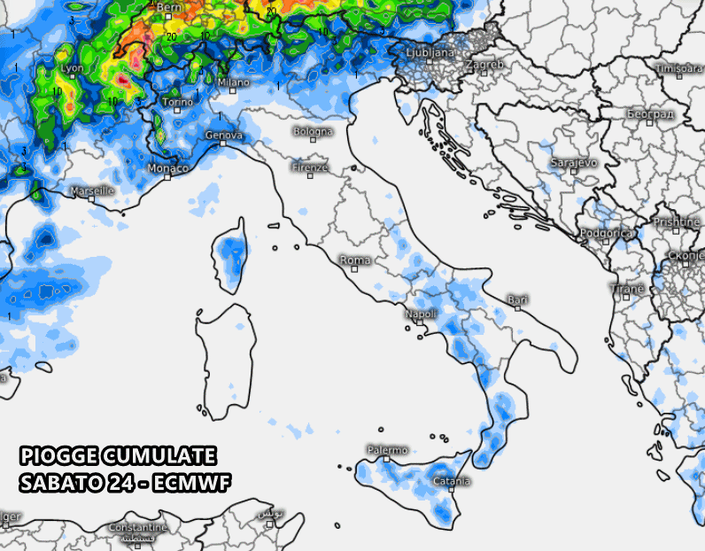 Anche il modello europeo ECMWF concorda su questa instabilità disorganizzata della giornata di sabato 24, ma come già specificato si tratterà di fenomeni molto isolati e che potrebbero risultare un po’ più estesi sull’Appennino centrale rispetto a quando indicato dalla mappa: